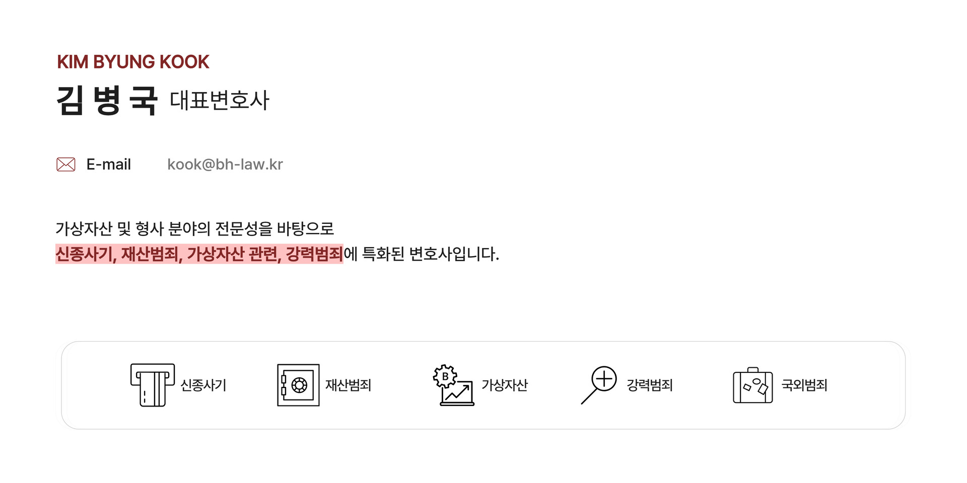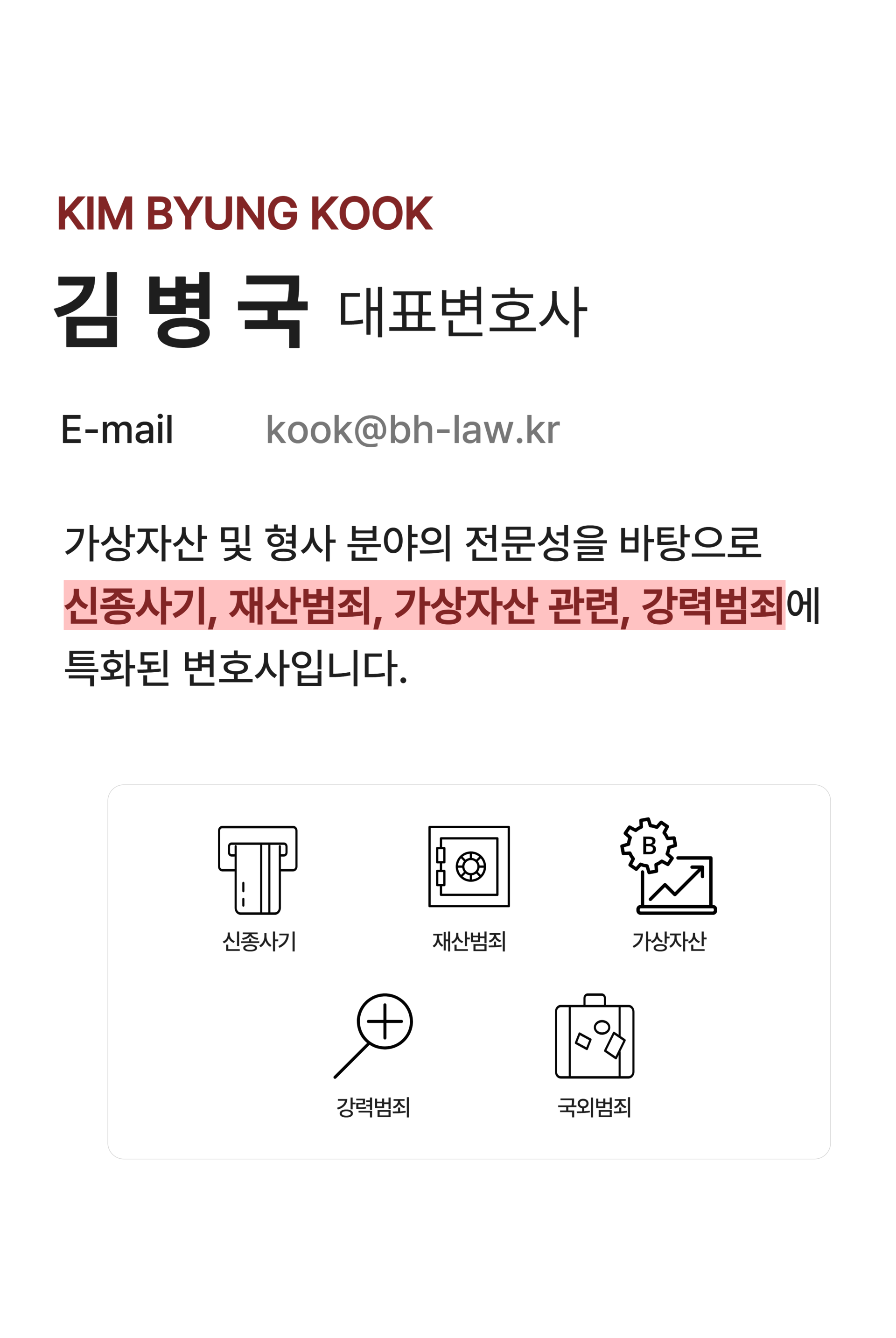 대표변호사 : 서준범, 김병국, 박세선 사업자등록번호 : 873-32-01543 Tel.02-568-3563 Fax.02-568-3564 E-mail. kook@bh-law.kr